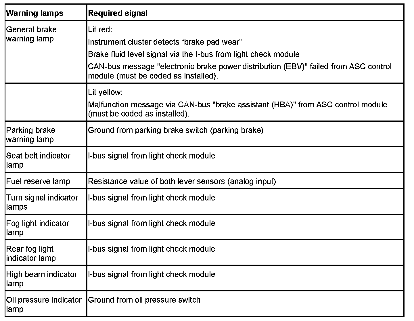Oil pressure indicator lamp: The warning lamp is switched by the oil pressure switch. The information from the oil pressure switch is read by the instrument cluster electronics (IKE) as status data and a corresponding I-bus telegram is sent to the light check module (LCM). When this signal is received, a corresponding message is sent from the LCM to the IKE where it is shown in the text display.