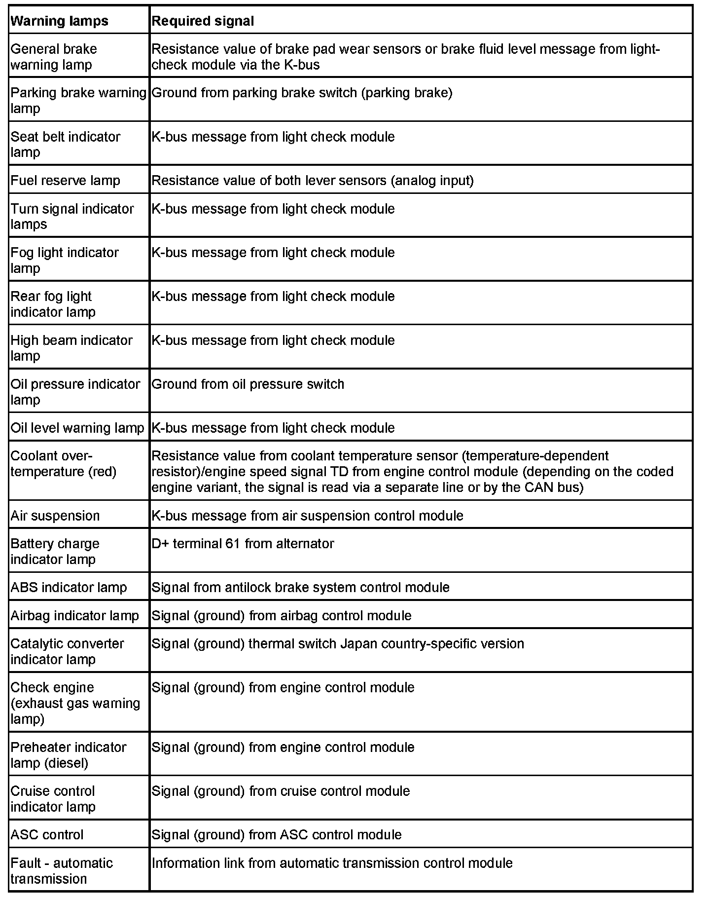 Air suspension: If coded, the warning lamp is switched by means of a corresponding K-bus telegram from the air suspension control module (EHC) to the instrument cluster.