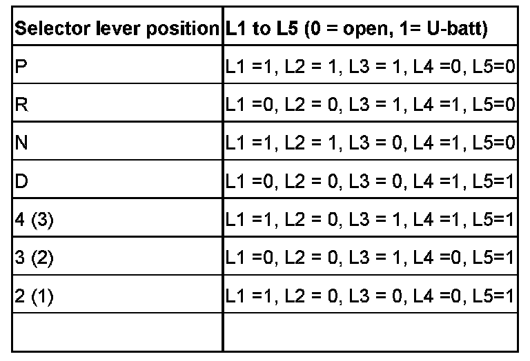 The EGS control unit detects the selector lever position by way of a switch on the transmission. This switch converts the current selector lever position into a code. This selector lever code is transferred via five lines (L1-L5) to the EGS control unit.
