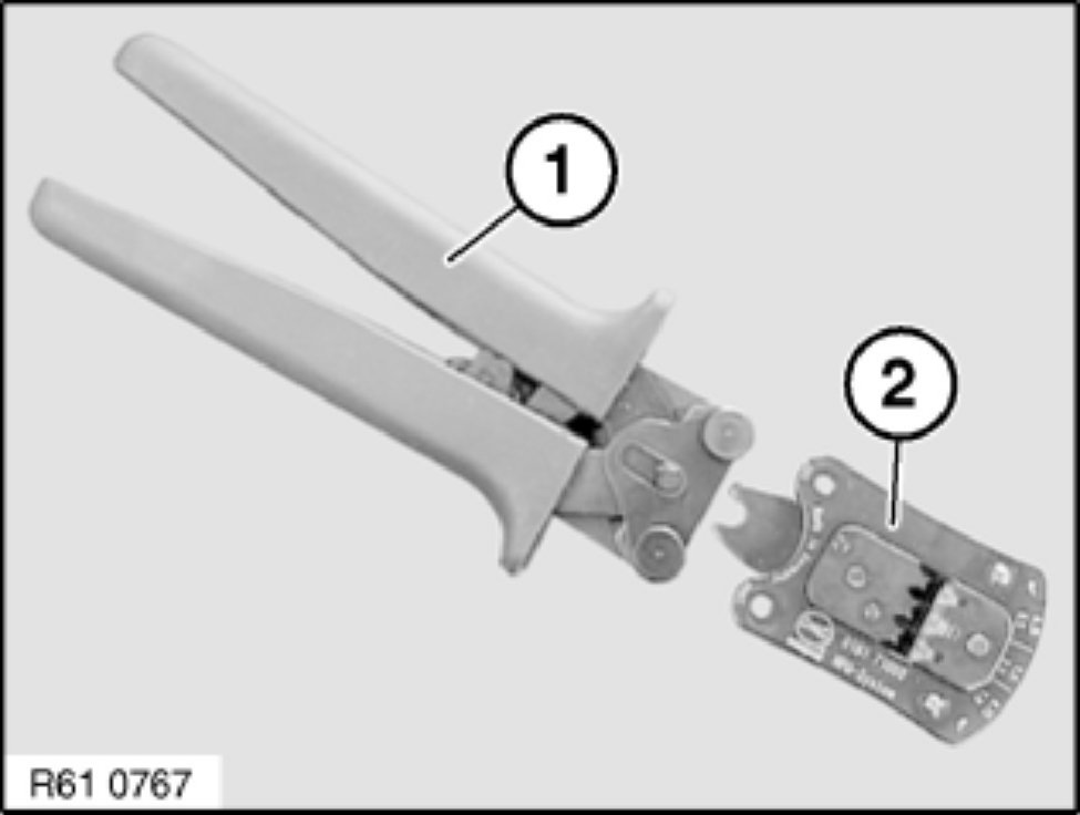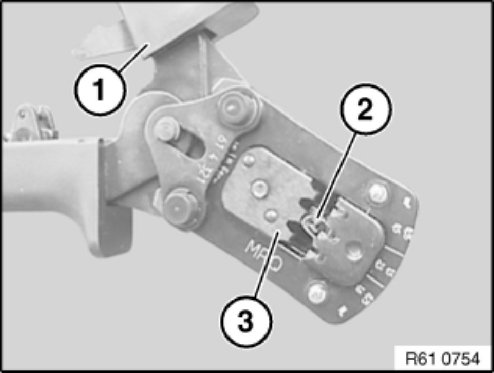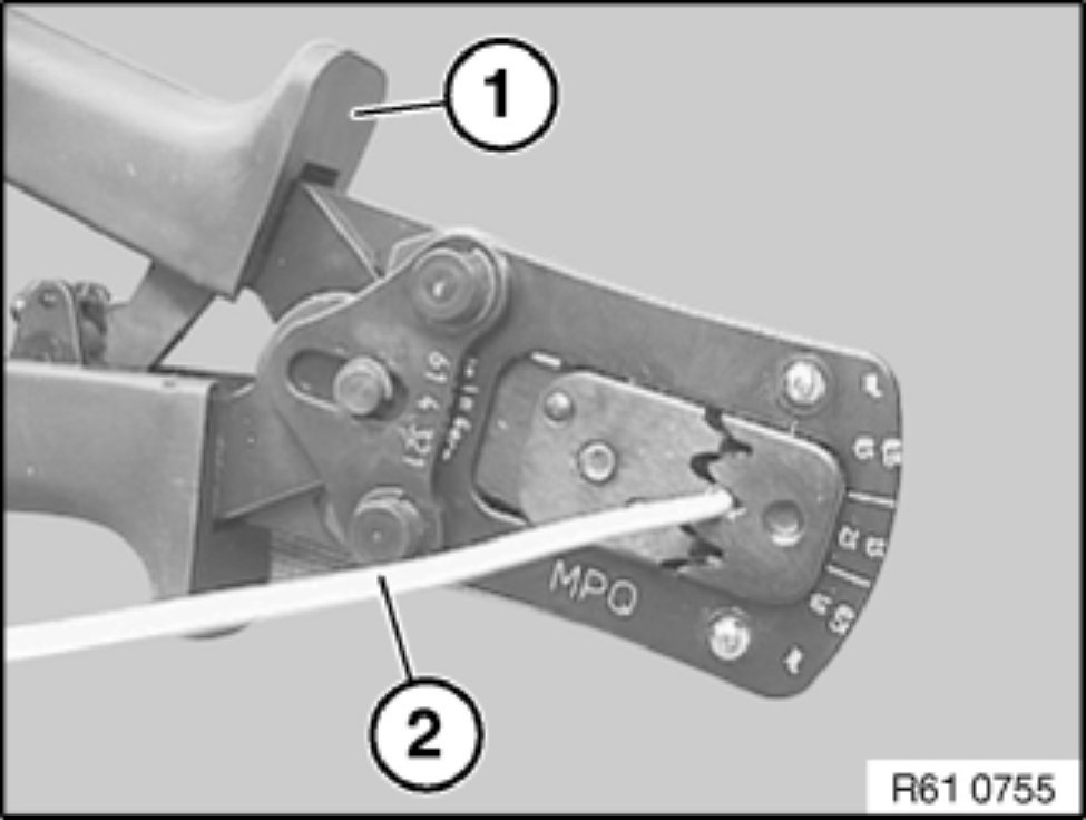 To crimp MPQ contacts, use pliers 61 4 321 (1) in conjunction with crimping head 61 4 325 (2) from crimping set 61 4 320.