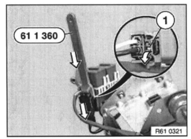 Unlock hook (1) with special tool 61 1 360 and slide plug housing downwards out of base.