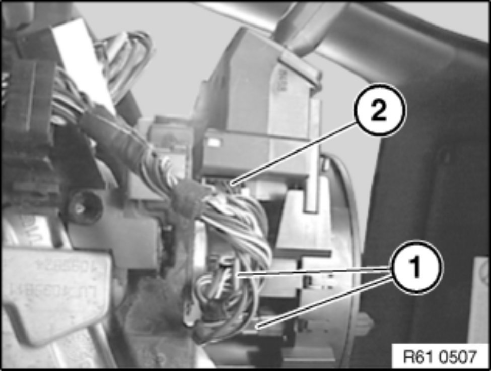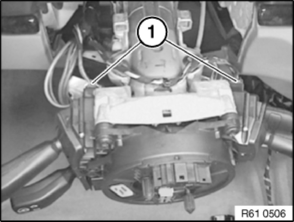 Unlock and disconnect plug connections (1) on turn indicator/headlight dipping stalk and on windscreen wiper stalk.
