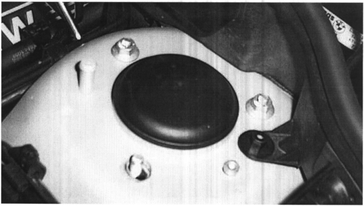 The locating pin at the strut mount is pressed in place and must be pried out for removal in order to make any camber corrections.