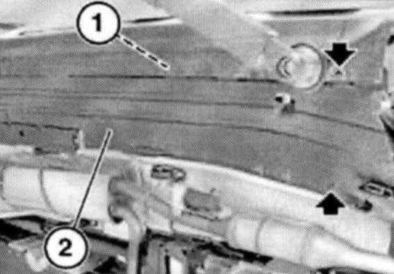 Release screws of underfloor panel (2) on right side of car. Release screws under sill cover on right (1).