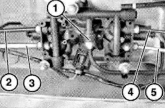Undo screw connection at pipe connections on valve block or accumulator unit (arrows) until sound of escaping air can be heard. With screw connection undone, wait approx. 2 mins. until pressure has been completely reduced (hissing sound ceases).