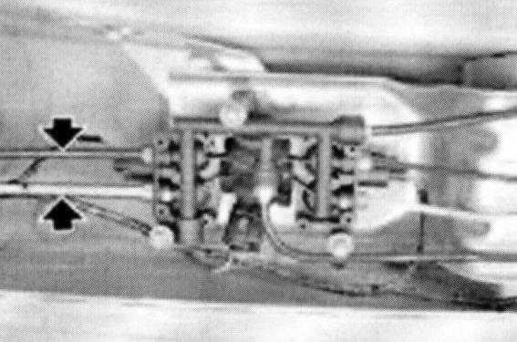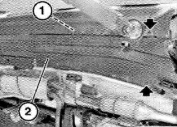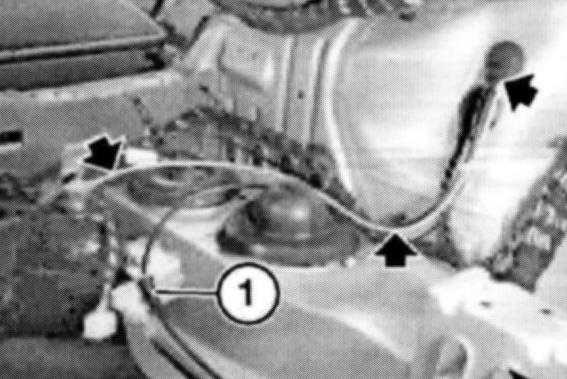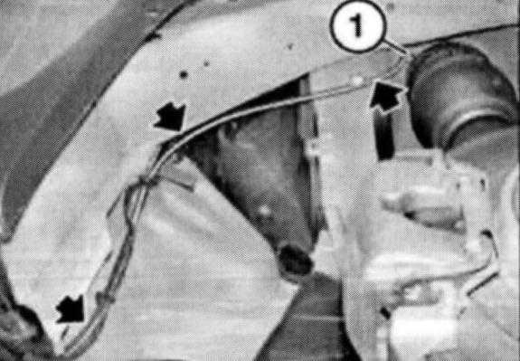 Release pipe following its progression (arrows) and press air spring strut into appropriate position in order to facilitate access to pipe connection.