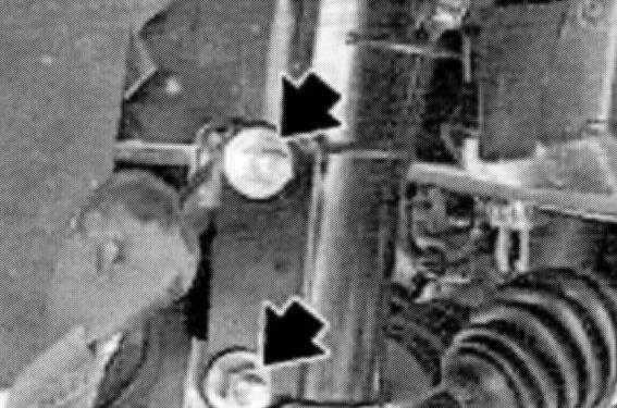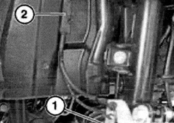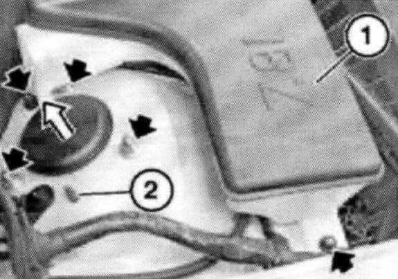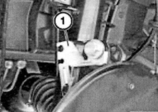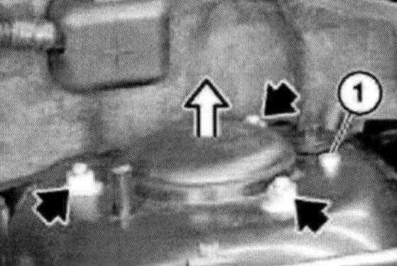 Right side of car: Release nuts securing washer fluid reservoir (1), bring reservoir into appropriate position in order to guarantee access to inner nut of spring strut support bearing/wheel arch connection.
