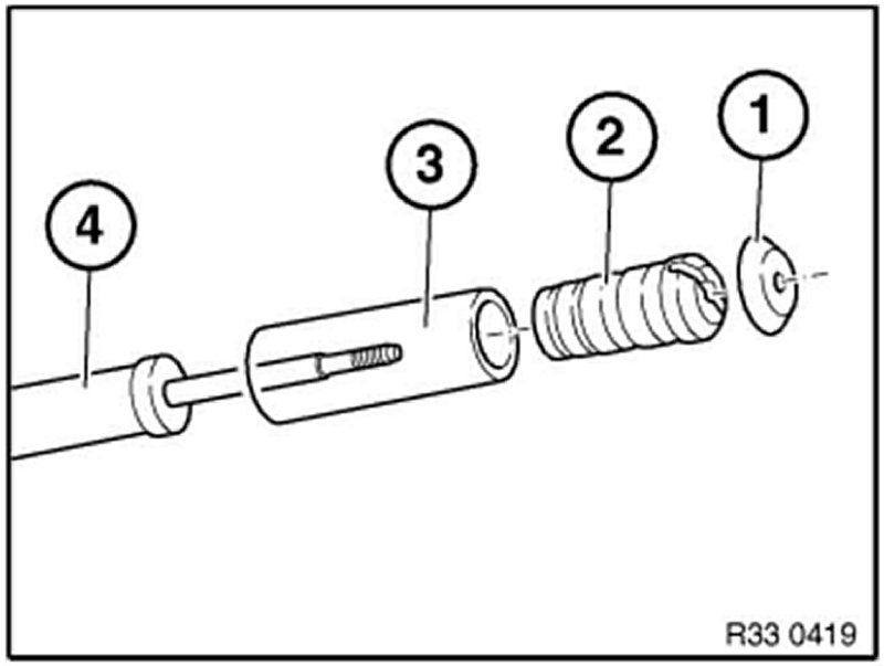 Remove support cup (1) and auxiliary absorber (2) with gaiter (3) from rear shock absorber (4).