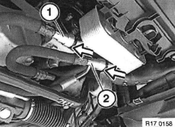Press lines (1/2) in direction of heat exchanger and pull locking ring towards rear.