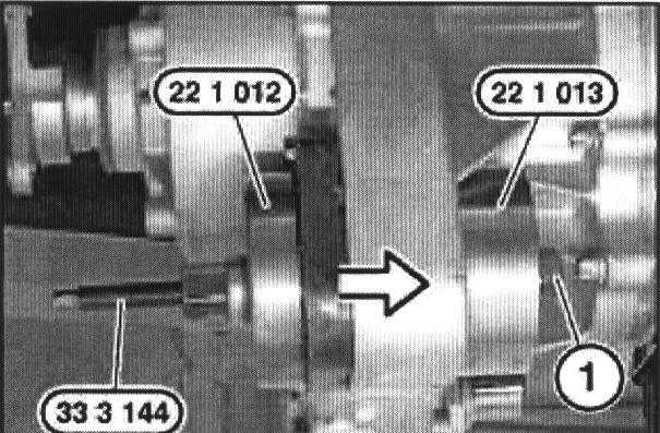 Pull out rubber mount with special tools 22 1 011/33 3 144 and nut (1).