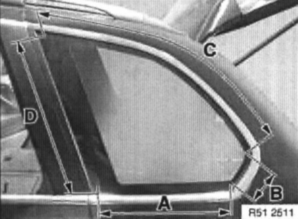 Fit door window with special tool 51 3 010 at bottom. Chrome strip (1) must be flush at front with body edge (2).