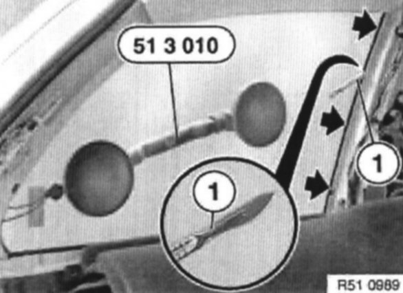 During the cutting procedure, a 2nd person must pull the window at the rear outwards at special tool 51 3 010.