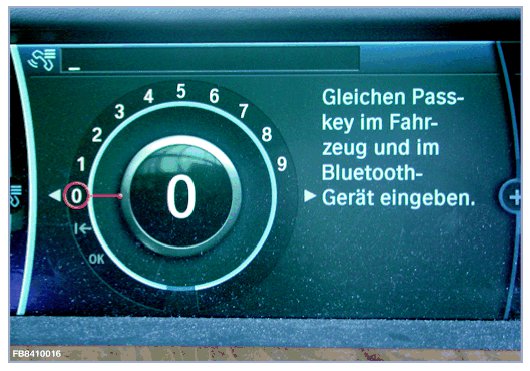 The Bluetooth passkey to be used can be found in the vehicle documentation or on the label on the telephone control unit for vehicles E46, E83, E53, E85, E86, E65, E66, E67, E68 and RR1, RR2, RR3 (depending on equipment). This can additionally be read out via diagnosis and the control unit functions of the telephone control unit.