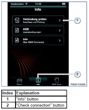 NOTE: The service employee must have special knowledge of BMW Connected in order to perform the self-diagnosis in accordance with specifications and interpret the information. The employee must be given suitable training beforehand. The BMW Connected page in the ASAP (Aftersales Assistance Portal) is available to the employee for assistance. It is also advisable to have an original Apple(TM) USB cable available for testing at the service employee's workplace.