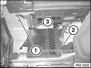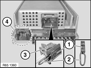Install cable jumper consisting of socket (1) (BMW Parts Service 6901844) and wire jumper (2) in connector (3).