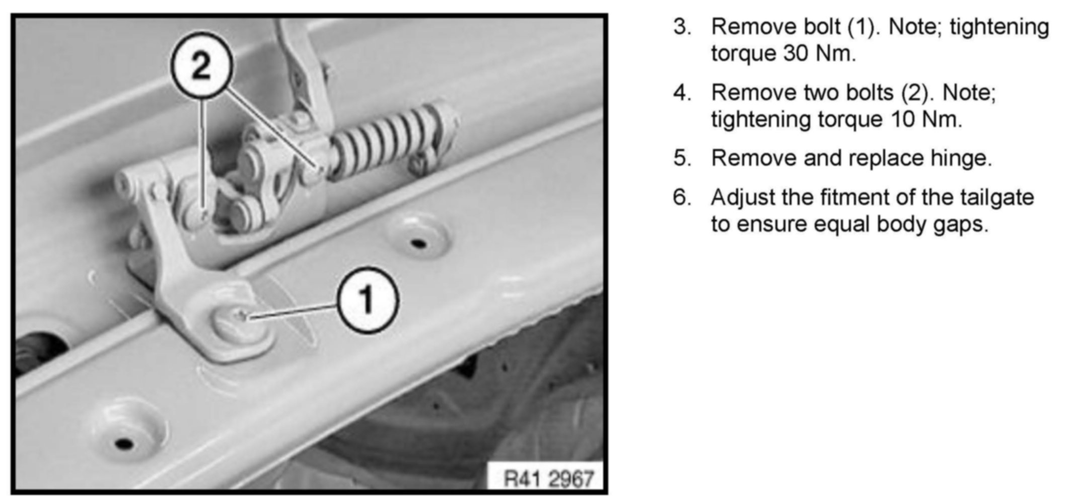 The repair instruction REP 41 62 051 "Remove and Replace left or right tailgate hinge (without hinge mounting bracket)" has been revised.