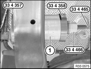 Pull on rubber mount (1) with special tools 33 4 357, 33 4 358, 33 4 466 and 33 4 465 as far as it will go.