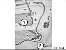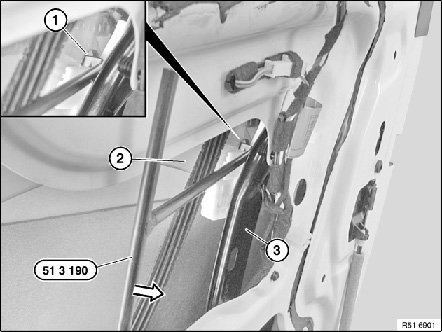 Insert special tool 51 3 190 into designated opening (1) of side window glass (2)
