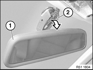 Snap out interior mirror (1) from mirror mount (2) towards front with increasing pressure (not abruptly) and remove.