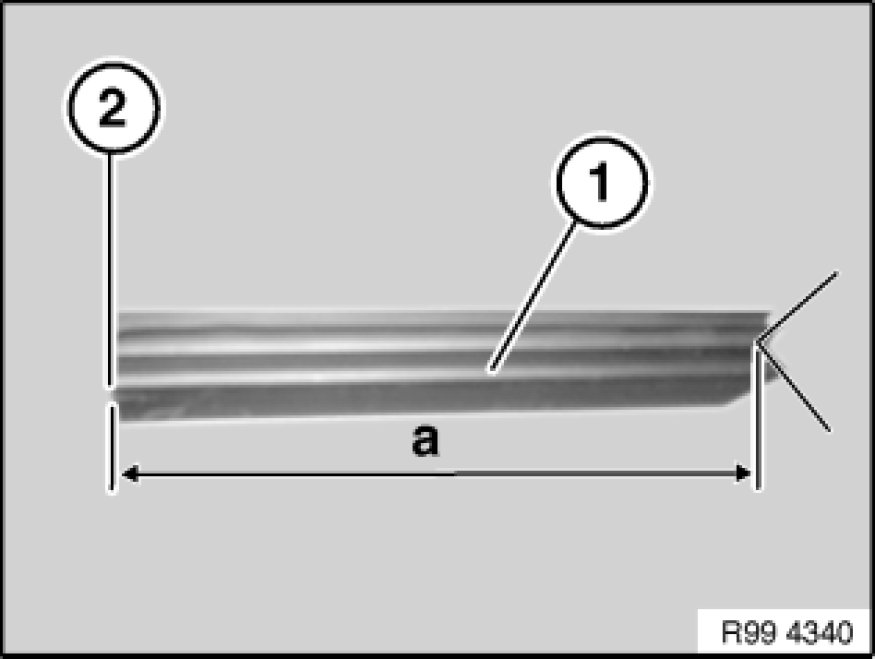 Cut rear window cavity cover strip (1) to length on straight side (2) to measurement a = 153 mm.