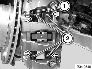 Release bolts (1) and pull off brake caliper with brake anchor plate towards rear.