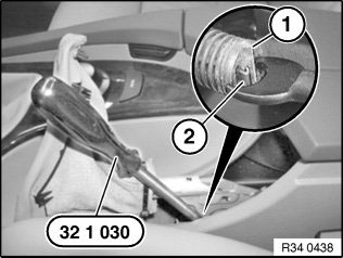 Actuate parking brake lever. Insert special tool 32 1 030. Press stop (1) of adjusting spring back to such an extent that retaining hook (2) engages in stop (1).