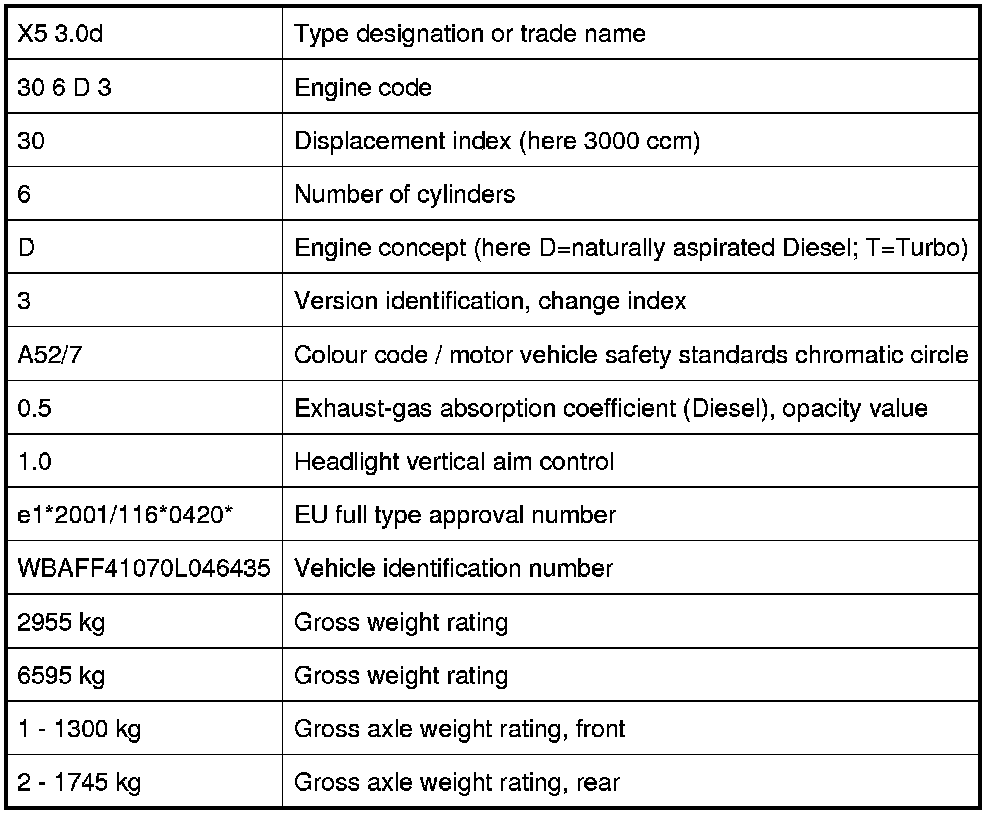 The type plate shows, in addition to the vehicle identification and homologation numbers and the weight specifications, some data pertaining to the testing of general-inspection-related systems: the adjustment specifications for the headlights and the engine code and the opacity value for the emissions test. Further general-inspection-related systems can be ascertained from the optional extra numbers.