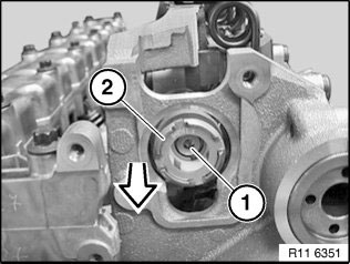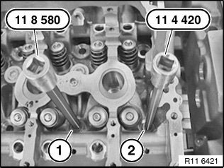 Release cylinder head bolts (2) M10 with special tool 11 8 580 from outside inwards.