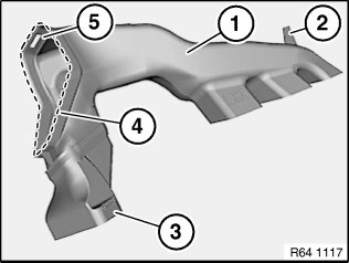 Insert right footwell heating duct (1) with adapter (3) in right rear compartment heating duct (4).