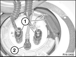 Carefully unlock tabs (1) and pull off fuel level sensor upwards in direction of arrow.