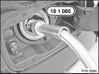 Slide extraction hose of extractor unit, refer to BMW Service Workshop Equipment and Planning Documentation, through special tool 16 1 080 into the fuel filler pipe, turning in the process if necessary.