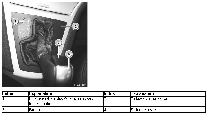 The gear selector switch (selector lever) enables the engagement of the individual drive positions or gears (Steptronic). The selector-lever position is transferred to the gearbox by means of a cable. The engaged drive position is shown visually via the shift-indicator illumination.