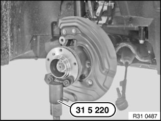 Secure special tool 31 5 220 with wheel studs to drive flange and support swivel bearing with workshop jack.