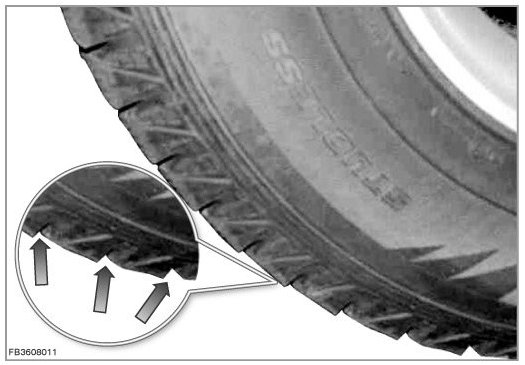 At the front tires of rear-drive vehicles, a saw-tooth-shaped wear can be partially seen. The individual blocks wear due to the slip which occurs when lifting up from the road surface due to the unloading of the inner tension.