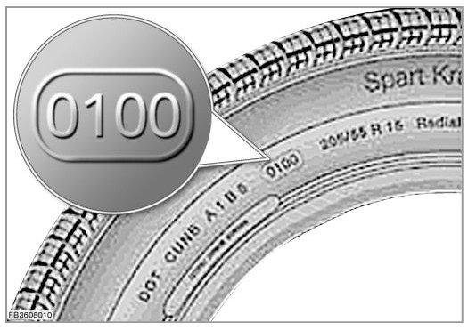 Tires after calendar week 01 in the year 2000 have a four-digit DOT number. DOT number 0100 (see graphic) specifies that the tires were manufactured in the 1st calendar week of 2000.