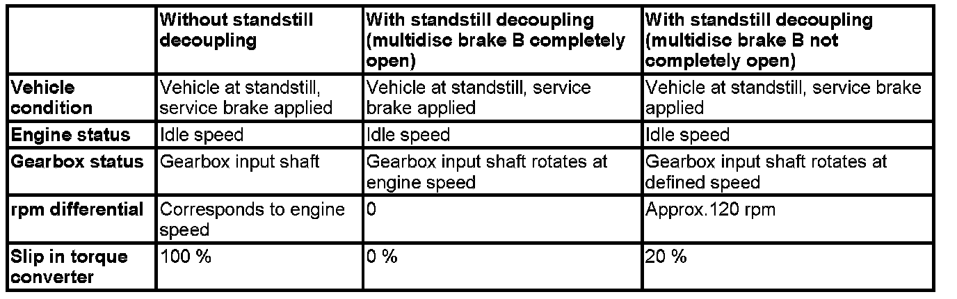To enable driving off free of deceleration and load alteration, multidisc brake B is not completely opened. A slight slip of approximately 20 % remains so that some torque is transmitted to the torque converter. If multidisc brake B was completely open, no torque would need to be transmitted to the converter (except the inner friction in the gearbox). Jerking could result when driving off. The following example shows the difference in the gearbox between a vehicle with/without standstill decoupling. Values are approximate because inner friction was not taken into account.