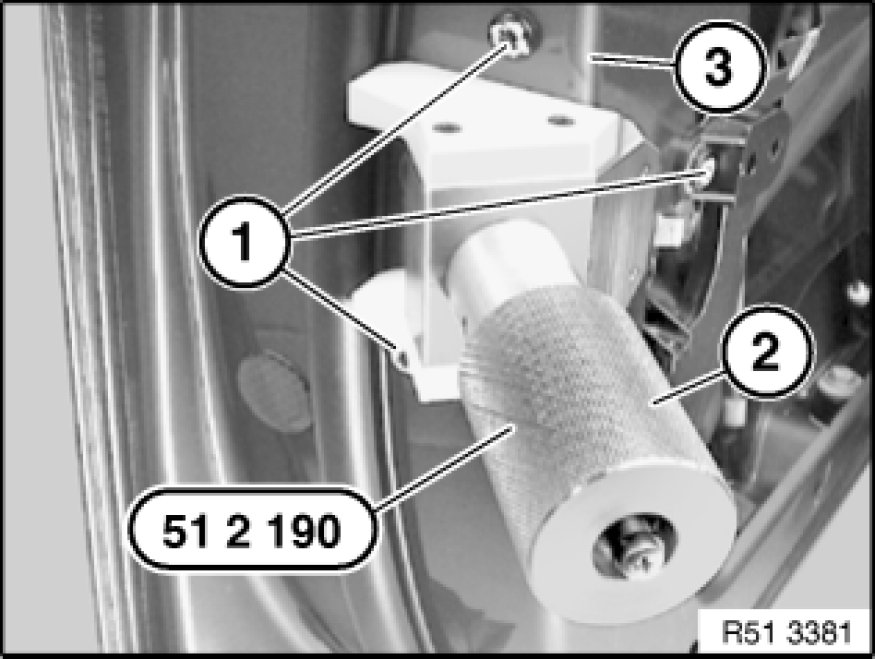 - Pretension door lock (1) with knurled screw (2) until special tool 51 2 190 51 2 190 Door Lock Tensioner just contacts corner points (3).
