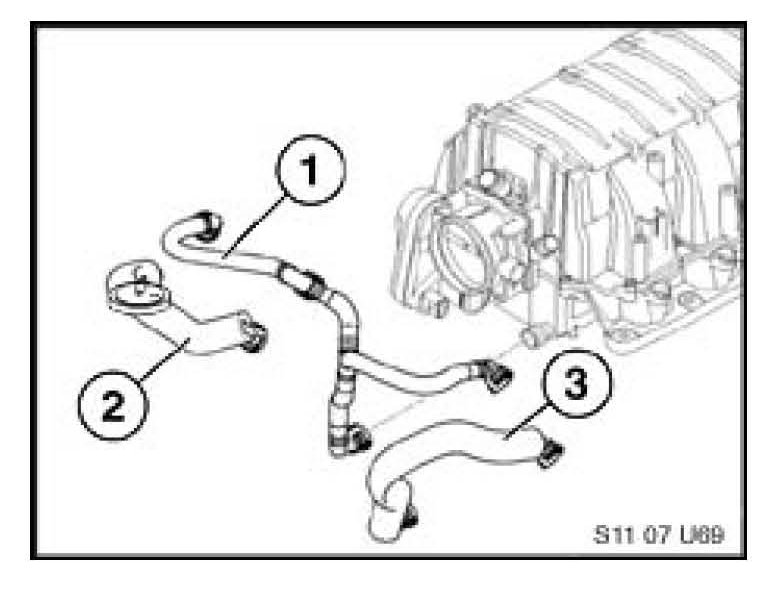 2. Remove the crankcase ventilation plastic corrugated hose (1) connecting the two cylinder head covers and intake system. Install the modified insulated hose with the external pressure regulating valve (2), using P/N 11 61 7 563 476. Install the insulated hose (3), using P/N 11 61 7 547 186.