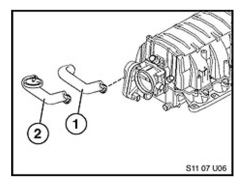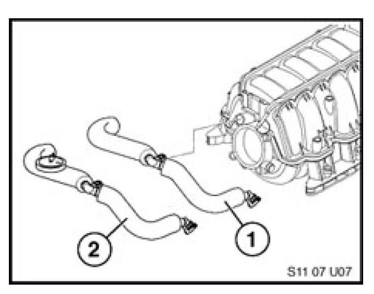 2. Remove the ventilation hose (1). Install the modified insulated hose with the external pressure regulating valve (2), using P/N 11 61 7 563 477 in the same location.