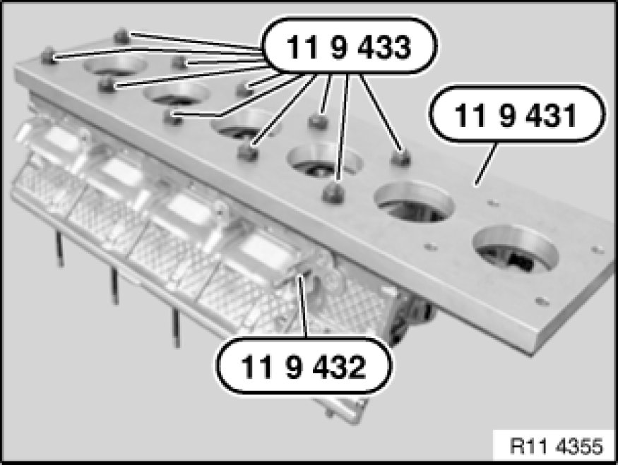 Place special tool 11 9 431 on cylinder head sealing surface, insert screws (special tool 11 9 433) and tighten down.