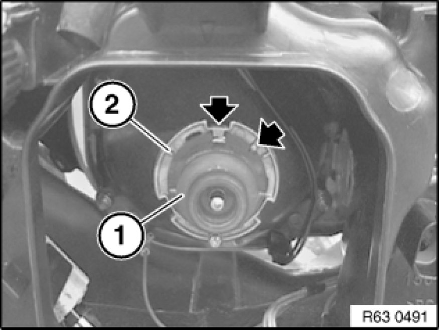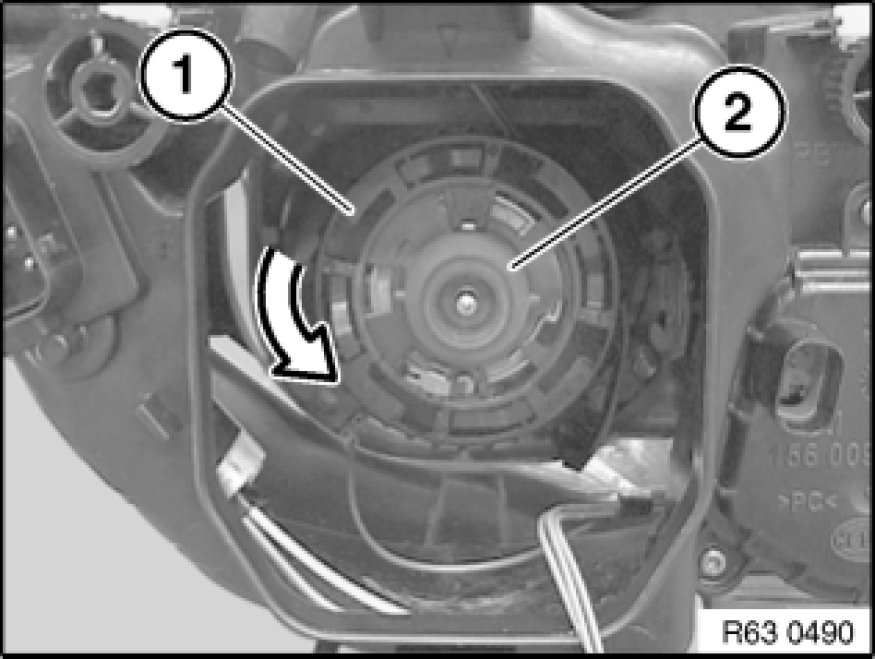 Turn retaining ring of lamp for xenon light (1) in direction of arrow and remove.