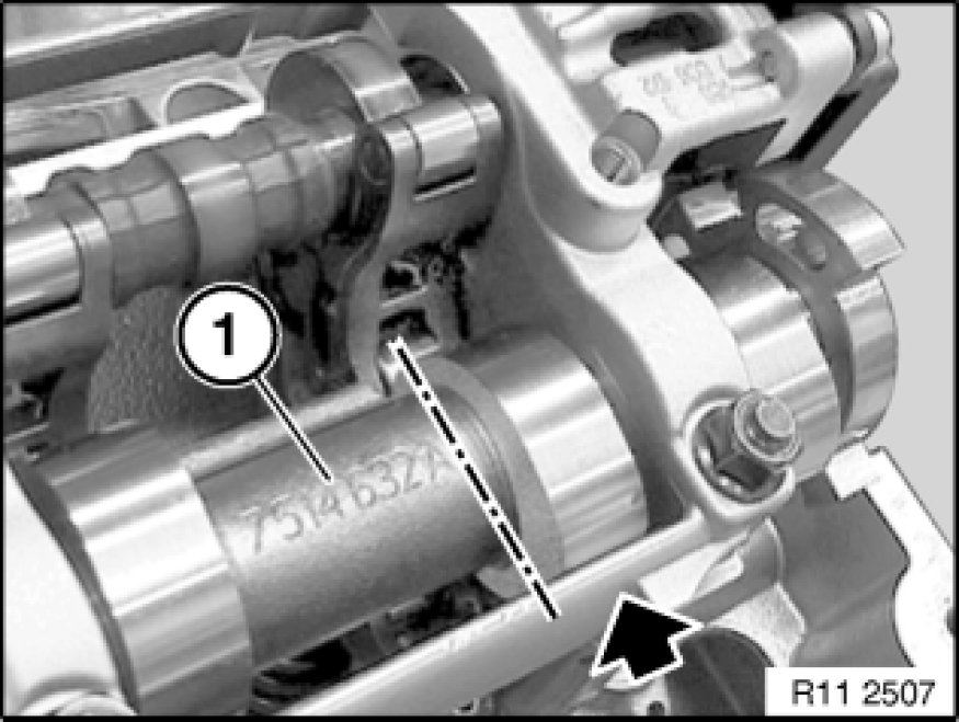 Rotate inlet camshaft against direction of rotation until lettering (1) on 8th cylinder points upwards in cylinder axis and cam is horizontal.
