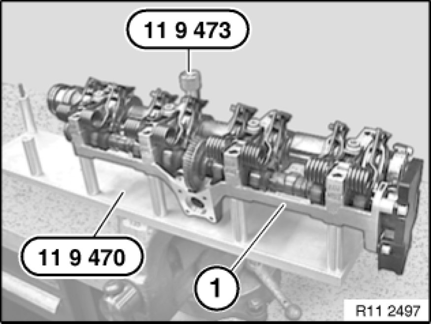 Place bearing bracket (1) with inlet camshaft and eccentric shaft as illustrated on special tool 11 9 470 11 9 470 Support.