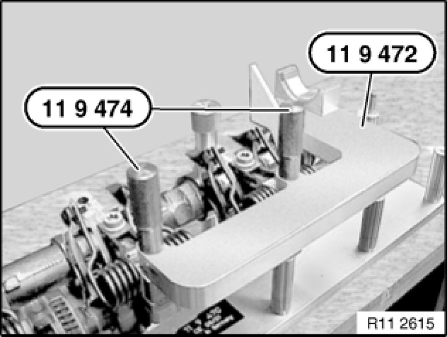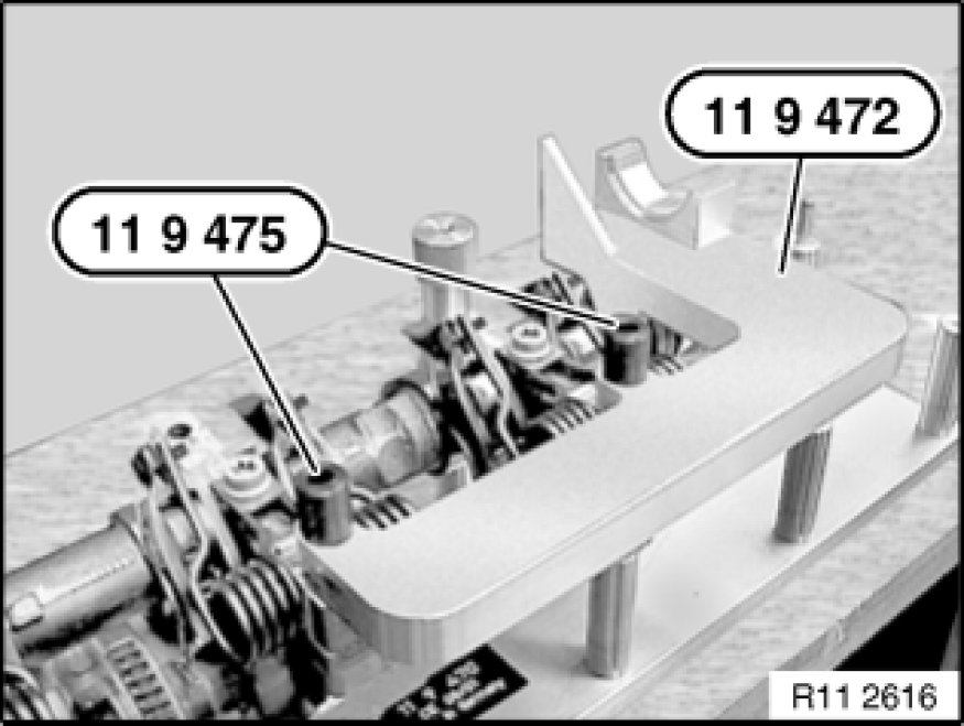 Special tools 11 9 472 11 9 470 Support and 11 9 475 11 9 470 Support prevent the inlet camshaft from rotating and moving while the intermediate levers are installed.