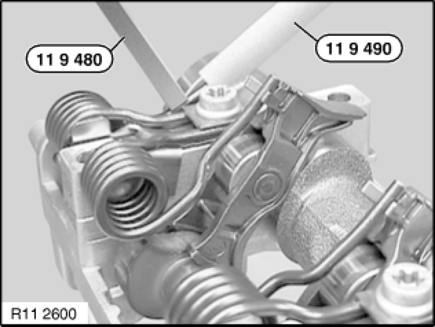 Support end of torsion spring protected with special tool 11 9 490 11 9 490 Holding Sleeve on inlet camshaft.