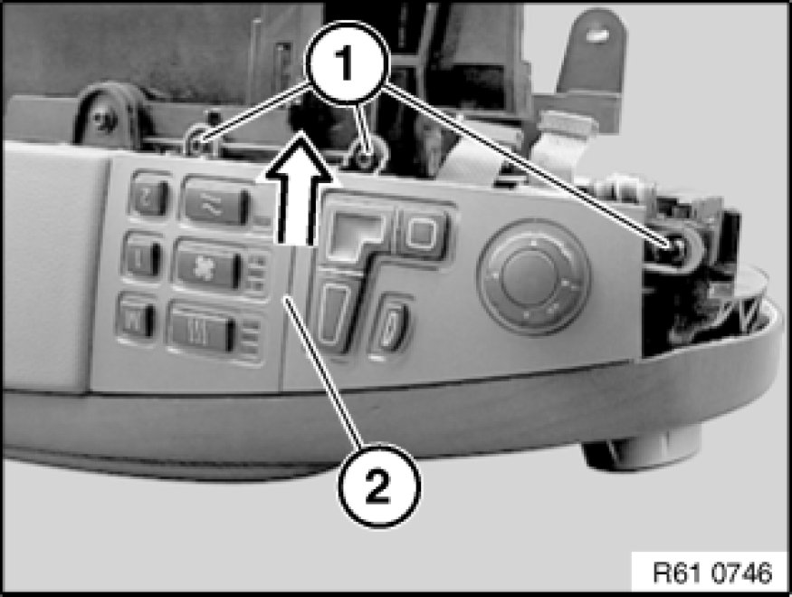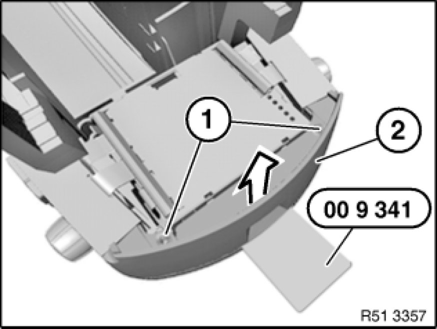 Lever out front center armrest trim (2) with special tool 00 9 341 and remove and direction of arrow.