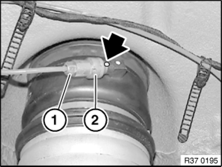 Carefully slacken banjo bolt (1) until the sound of escaping air can be heard. In so doing, grip residual pressure holding valve (2) to avoid damaging the seal paint (arrow).