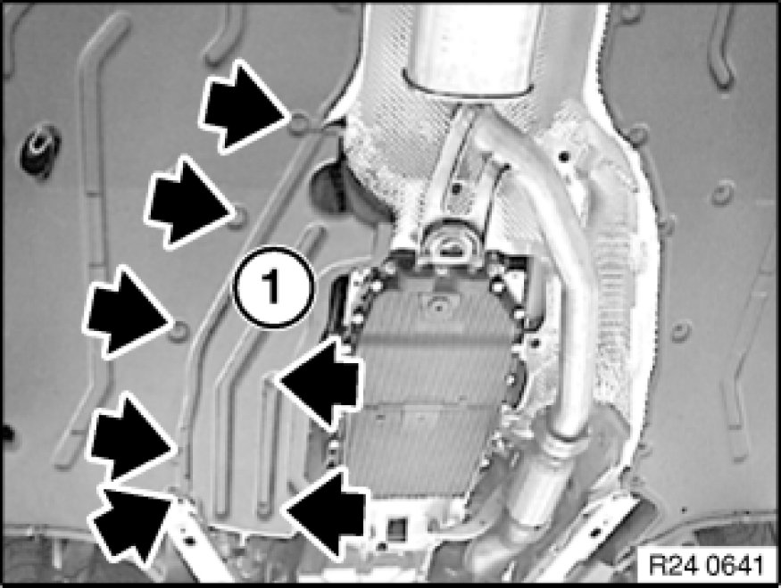 Release screws and remove transmission underbody protection (1).
