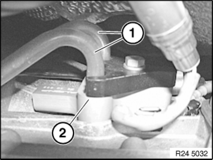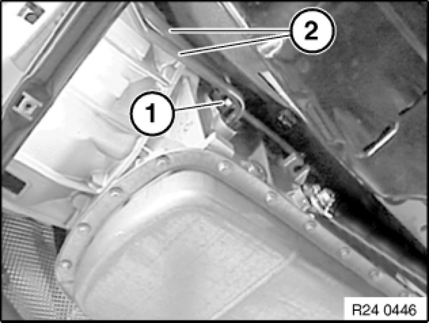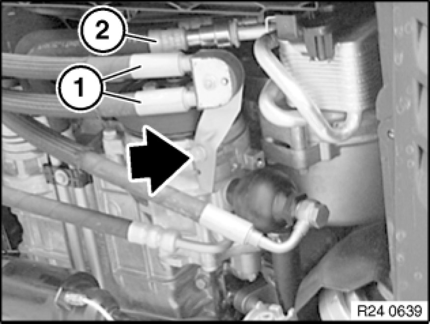 Release holder so that lines of power steering (1) do not collide with line from transmission oil cooler (2).