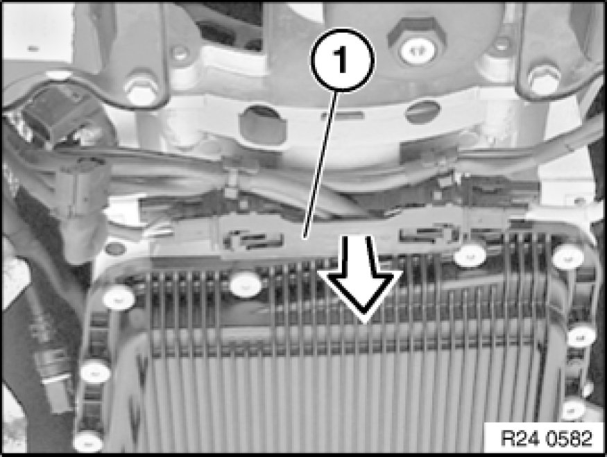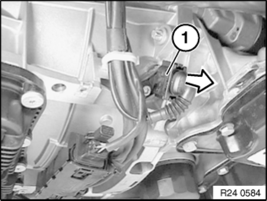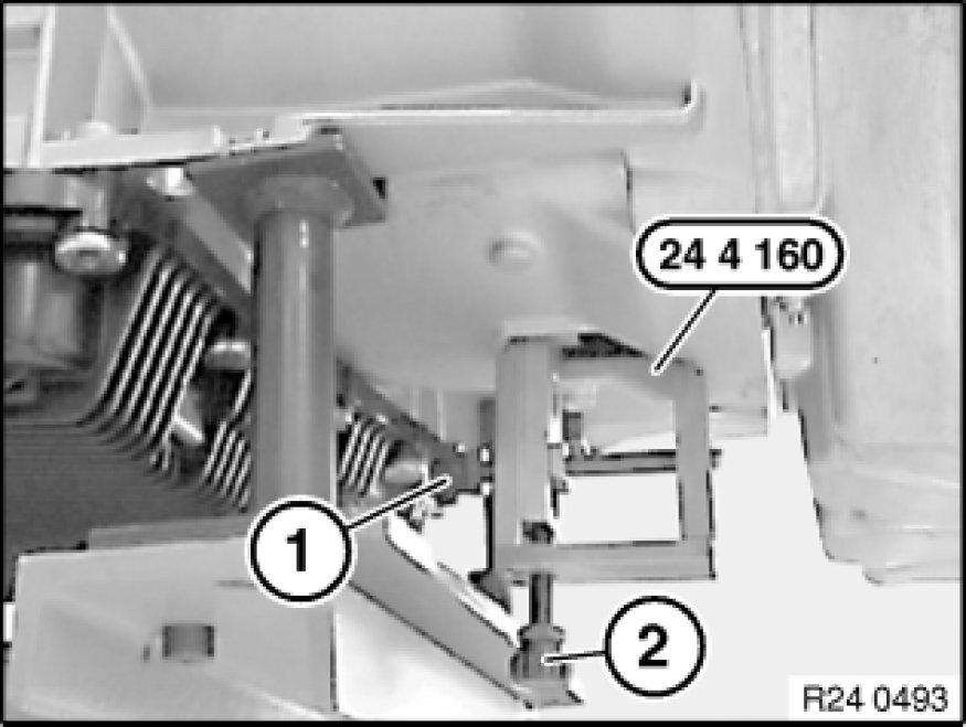 Insert special tool 24 4 160 24 4 160 Support Bracket into opening of transmission housing and clamp gently with screw (1).